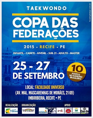 A Confederação Brasileira de Taekwondo (CBTKD) e a Federação Pernambucana de Taekwondo irão realizar dois eventos que vão mexer com Recife entre os dias 25 e 27 de setembro: a Copa das Federações 2015 e a II etapa do Campeonato Brasileiro Faixas Coloridas. Com a apoio da Petrobrás e Daedo, os eventos ocorrerão na Faculdade Universo, que fica na Av. Mal. Mascarenhas de Moraes, 2169, no bairro Imbiribeira.